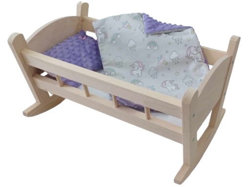 Urocza kołyska drewniana dla lalek, wykonana z drewna świerkowego.