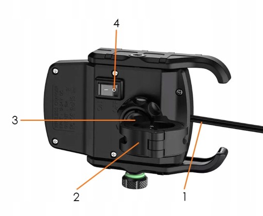 Elementy uchwytu Kabel zasilający o długości 1.5 m zakończony konektorami. Uniwersalny uchwyt można zamontować praktycznie do każdej kierownicy o średnicy od 20 do 30 mm. Obrotowy przegub głowicy umożliwia ustawienie telefonu w dogodnej pozycji. Wyłącznik to wygodny sposób na odcięcie zasilania od gniazda USB.