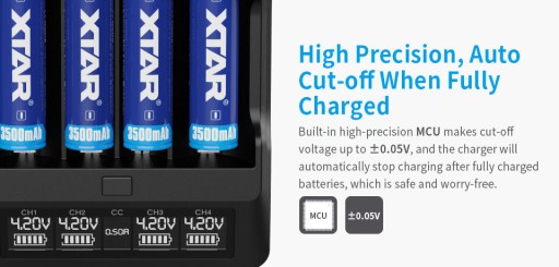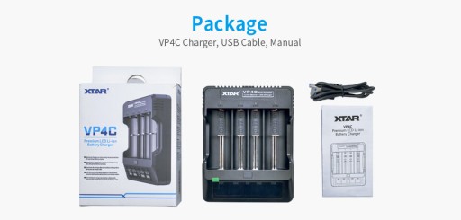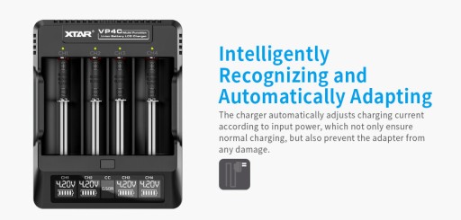 Profesjonalna procesorowa ładowarka z trzystopniowym procesem ładowania TC/CC/CV. Xtar VP4 ładuje standardowe ogniwa Li-ion 3,6 / 3,7V w rozmiarach 10440, 14500, 14650, 16340, 17500, 17670, 18350, 18500, 18650, 18700, 20700, 21700, 22650, 25500, 26650, 32650. Akumulatory o największych rozmiarach, tj, 22650, 26650 i 32650 można ładować tylko w dwóch skrajnych kanałach.