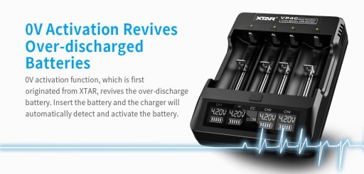 Ładowarka Xtar VP4C posiada funkcję reaktywacji ogniw głęboko rozładowanych i ogniw o napięciu 0V. Wiele ładowarek na rynku nie jest w stanie naładować takich akumulatorów. Tutaj z pomocą przychodzi ładowarka Xtar VP4C, która w wielu przypadkach pozwala na 'odratowanie' takich ogniw. Wystarczy włożyć głęboko rozładowany akumulator do ładowarki VP4C, tak jak przy normalnym ładowaniu - ładowarka wykryje rozładowane ogniwo i podejmie próbę jego reaktywacji.