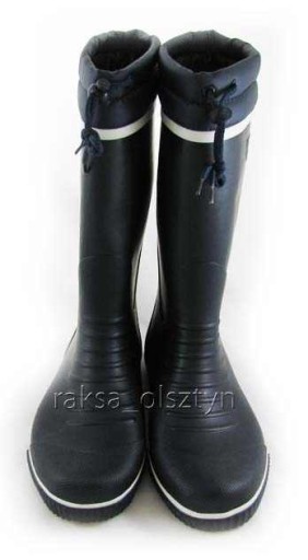 Kalosze żeglarskie, wykonane z miękkiego kauczuku. Zakończone delikatnym, miękkim materiałem, wiązane na górze. Buty posiadają przeciwpoślizgową podeszwę.