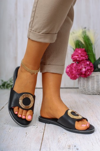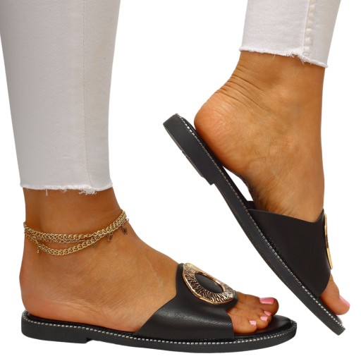 Kapki damskie w kolorze czarnym, idealne na każdą okazję. Wkładka ze skóry ekologiczne zapewnia komfort noszenia przy codziennym użytkowaniu. Wykonane z wysokiej jakości materiałów, są wygodne, i lekkie. Złota ozdoba dodaje im uroku oraz doda elegancji w połączniu z każdą stylizacją. Idealne na lato, na spacery, oraz wyjścia, są miękkie, cieszące się uznaniem wielu, dodają stylu.