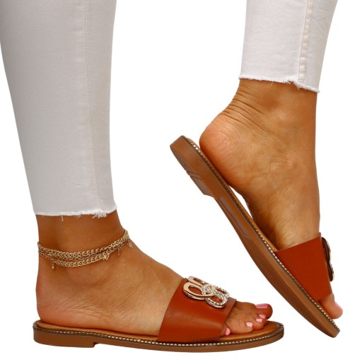 Kapki damskie w kolorze brązowym, idealne na każdą okazję. Wkładka ze skóry ekologiczne zapewnia komfort noszenia przy codziennym użytkowaniu. Wykonane z wysokiej jakości materiałów, są wygodne, i lekkie. Złota ozdoba dodaje im uroku oraz doda elegancji w połączniu z każdą stylizacją. Idealne na lato, na spacery, oraz wyjścia, są miękkie, cieszące się uznaniem wielu, dodają stylu.