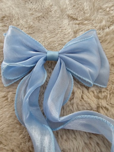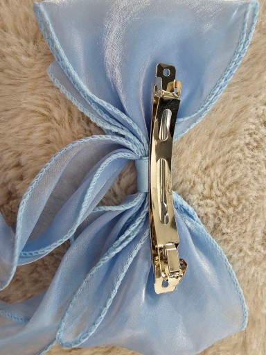 Mam do sprzedania przepiękną niebieską spinkę do włosów w kształcie kokardy. Długość wstążek to 18 cm. Szerokość kokardy to 20 cm. Kokarda jest uszyta z aksamitnego materiału. Jest bardzo przyjemna w dotyku. Idealnie wpasowuje się jako dodatek do outfitu.