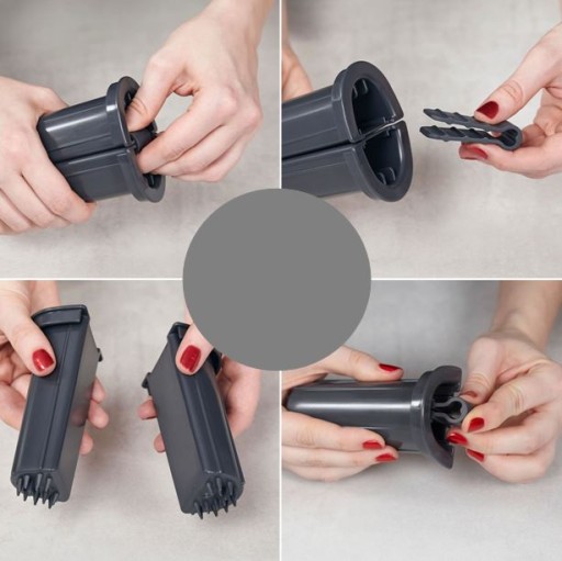 Nadziewarka WunderZoodlera została zaprojektowana w taki sposób, aby można było w niej przechowywać trzy spiralne ostrza. Ubijak i ostrza są następnie po prostu umieszczane w korpusie WunderZoodler. Dzięki temu zawsze masz wszystko gotowe, a Twój WunderZoodler jest gotowy do następnego użycia bez ryzyka kontuzji i długich poszukiwań potrzebnego ostrza.