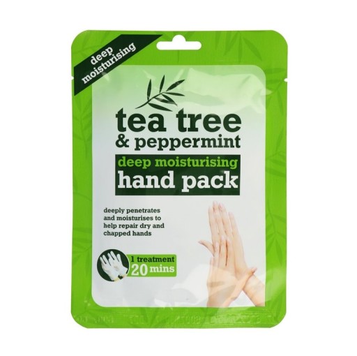 Rękawiczki nawilżające Xpel Tea Tree & Peppermint Deep Moisturizing Hand Pack dogłębnie nawilżają i przyjemnie chłodzą skórę dłoni. Formuła wzbogacona w wyciąg z drzewa herbacianego i mięty przynosi ulgę zmęczonym dłoniom, masło shea i witamina E doskonale zwalczają suchość i utrzymują wilgoć w naskórku, służą do głębokiego nawilżania dłoni.