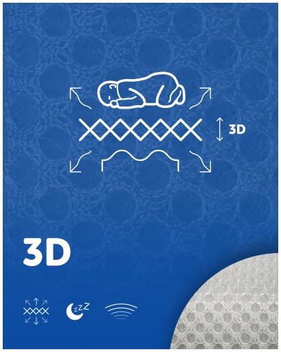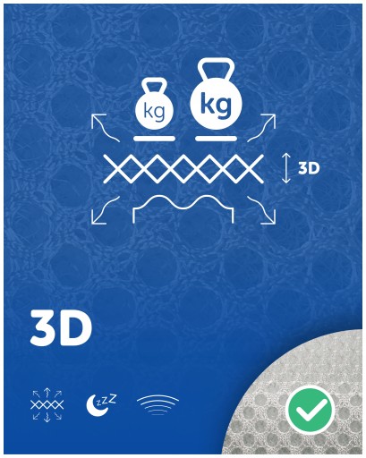 W konstrukcji zastosowano siatkę dystansową 3D, która umożliwia stały przepływ powietrza i pomaga utrzymać suchy, przyjemny mikroklimat snu.