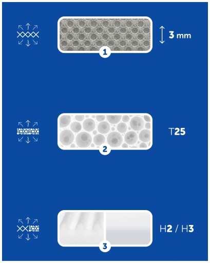 2️⃣ Pianka T25 – stabilna i sprężysta, wspiera konstrukcję materaca i umożliwia odprowadzanie wilgoci przez warstwy pokrowca.
