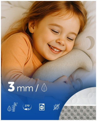 Strukturalna warstwa wentylacyjna umożliwia swobodny przepływ powietrza i wspiera odprowadzanie ciepła, co jest szczególnie ważne u dzieci, które łatwo się przegrzewają lub śpią na brzuszku.