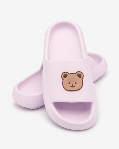 Świetne damskie gumowe klapki na płaskiej podeszwie, paseczek zdobiony uroczym misiem. Idealny wybór na wakacje!