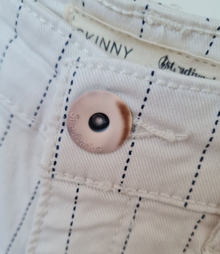 Delikatnie odbarwiony kolor guzika, minimalna plamka na kolanie.