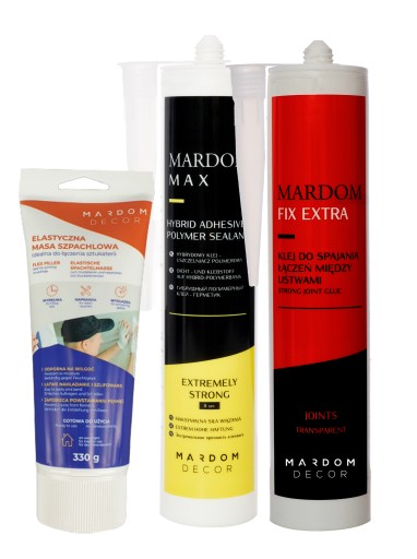 - Listwy karniszowe dodatkowo powinno się połączyć klejem do łączeń Mardom Fix Extra . Klej ten zapobiega pękaniu w miejscu łączenia ze sobą listew. Miejsca na które nakładany będzie klej muszą być suche i odpylone. Łączenia uzupełniamy i szpachlujemy Elastyczną Masą Szpachlową, a następnie drobnym papierem ściernym docieramy, szlifujemy to miejsce.