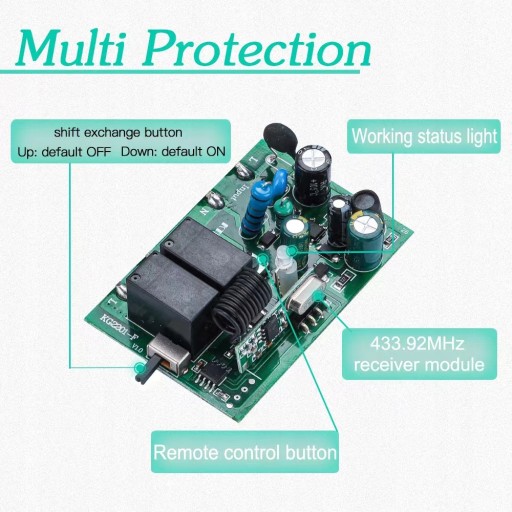 parametry techniczne: Model produktu: KG2201F-10 ^ Napięcie zasilania: AC90-250v Prąd spoczynkowy: 8mA Częstotliwość pracy: 433 MHz Moc regulacji: 2200 W Czułość odbioru:-105dbm Odchylenie częstotliwości: ± 0,2 MHz; Metoda kodowania: typ uczenia się Tryb pracy: samoblokujący, blokujący, bezprzewodowy; Metoda modulacji: ZAPYTAJ zasięgu zdalnego sterowania: 100 M (otwarty i wolny od dostępu) Rozmiar PCBA: 63 mm * 43 mm * 20 mm Rozmiar systemu: 89 MM * 51 MM * 26 MM