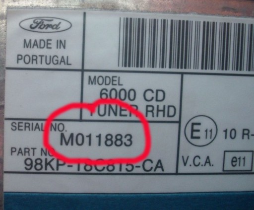 Wylacz radio i nacisnij przyciski 6+1 lub 6+2 lub 5+2 Z przeskakujacych znakow na wyswietlaczu szukaj M123456 lub V123456 Jesli nie wyswietli takiego nr trzeba radio wyciagnac i odpisac ten nr z naklejek.