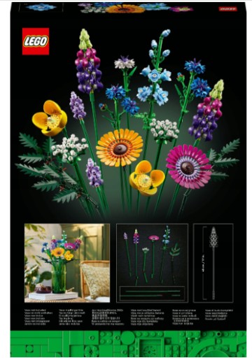 Złożony całkowicie ze szczegółowych klocków LEGO bukiet z polnych kwiatów obejmuje osiem gatunków kwiatów na regulowanych łodygach. Początkujący floryści i wielbiciele kwiatów mogą spędzić wiele godzin na budowaniu i odkrywaniu kwiatów inspirowanych chabrami, lawendą, makami walijskimi, trybulą leśną, paprocią skórzastą, gerberami, ostróżkami i łubinem. Po ukończeniu modelu kwiaty LEGO można ustawić w ulubionym wazonie, tworząc piękną ozdobę, która zasieje ziarno radości w każdym pomieszczeniu.