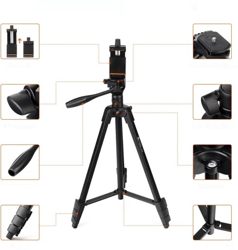 ✅ Lekki statyw: Nogi statywu można regulować w trzech poziomach. Maksymalna wysokość może osiągnąć 54 cale (trzy zamki pasa muszą być w pełni obrócone, aby zabezpieczyć nogi). Lekka aluminiowa konstrukcja waży 650 gramów. Maksymalna nośność na poziomej podłodze wynosi 3 kg, co czyni go zarówno stabilnym, jak i lekkim. Statyw możesz zabrać ze sobą do samolotu.