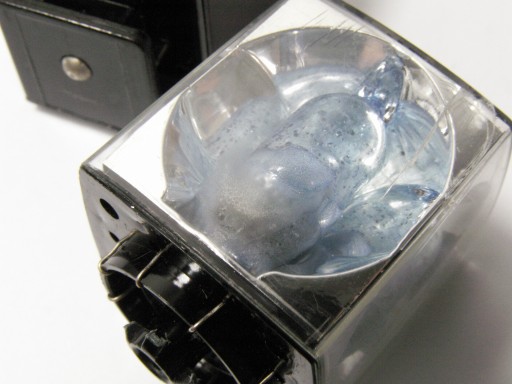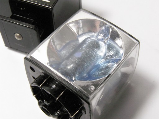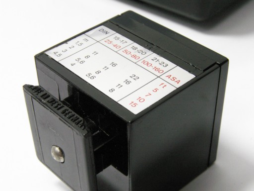 Bardzo ciekawwy adapter pozwalający zastosować żarówki spaleniowe - takie jak ta kostka/kubik z 4 żarówkami (wciąż czasem dostępne i Philipsa i Sylvanii, na aukcjach, nawet obecnie są dostępne na Allegro) na praktycznie każdym aparacie z gorącą stopką, nie ma potrzeby użycia wężyka. Fajna ciekawostka dla kolekcjonera. Do tego oryginalne plastikowe etui Zeiss Ikon. 1 czy 2 żarówki w kostce są wciąż dobre, 2 lub 3 spalone.