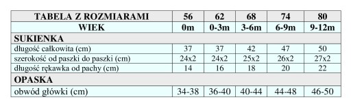 - Istnieje możliwość skompletowania innych rozmiarów poszczególnych części kompletu ( np. sukienka rozmiar 68, a płaszczyk rozmiar 62 itp.)