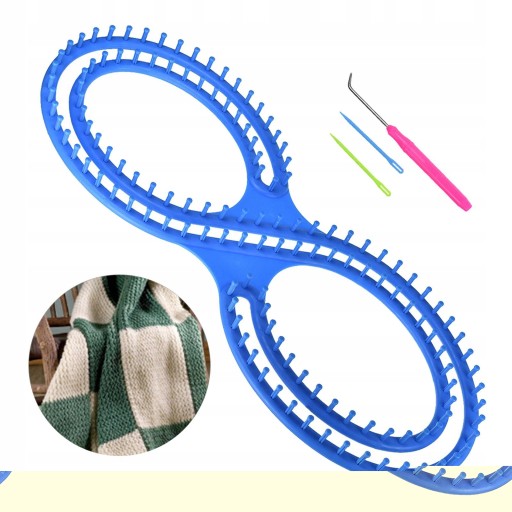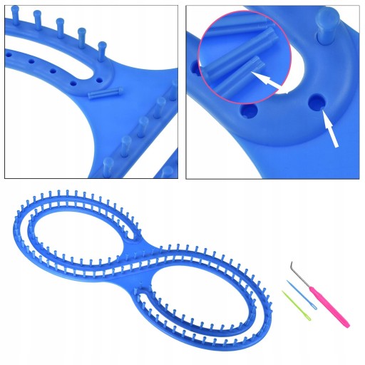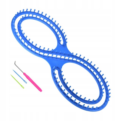 Zestaw krosna dziewiarskiego zawiera: krosno w kształcie 8, 2 szt plastikowych igieł, szydełko