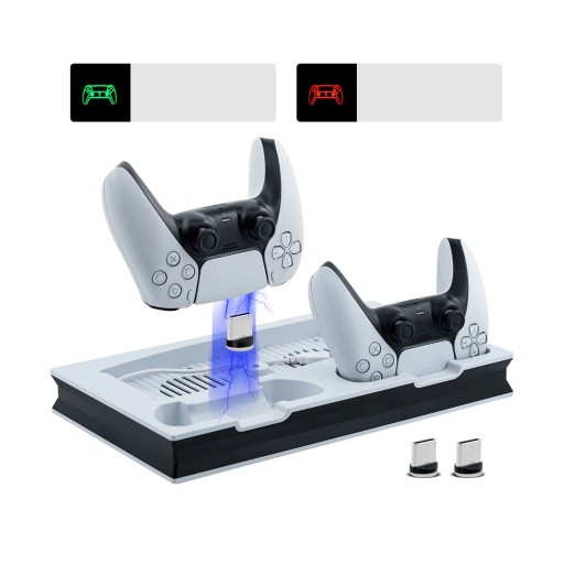 2. 【PODWÓJNE SZYBKIE ŁADOWANIE I WIELE METOD ZASILANIA】 Stacja ładująca PS5 może w pełni naładować 2 kontrolery PS5 Dualsense w ciągu 3.5-4 godzin jednocześnie. Wskaźniki LED wyraźnie pokazują stan ładowania. Czerwony: ładowanie; Zielony: w pełni naładowany/gotowość. A wentylator PS5 może być zasilany przez konsolę PS5 lub szybki zasilacz sieciowy 5 V/2 A, co zapewnia większy wybór metod ładowania! WSKAZÓWKI: Stacja dokująca kontrolera PS5 automatycznie odłączy zasilanie po pełnym naładowaniu, aby chronić sprzęt.