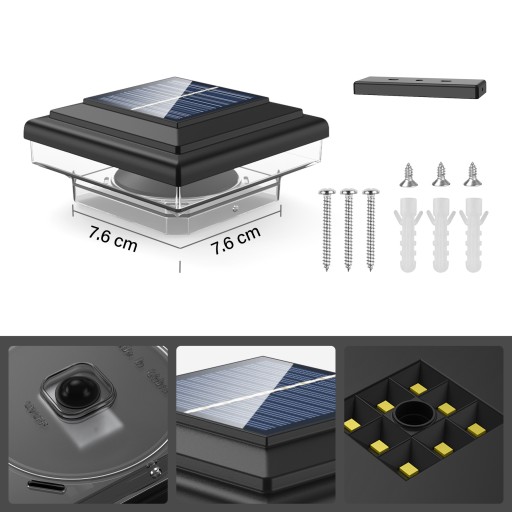 Podstawa lampy solarnej o wymiarach 76 mm x 76 mm. Ze stałym wspornikiem montażowym. Słoneczne zaślepki słupków doskonale nadają się do słupków ogrodzeniowych 4x4 cm, 5x5 cm, 6x6 cm, 7x7 cm, 8x8 cm, 9X9 cm, 10X10 cm. Zawiera śruby ze stali nierdzewnej, które biegną pionowo przez podstawę mocowania i do górnej części słupka. Oświetlenie słupka tarasowego bez plątaniny kabli, bez kosztów i kłopotów związanych z profesjonalną instalacją.