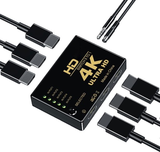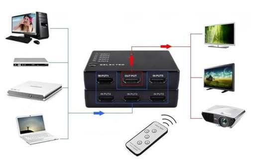 Do urządzenia do 5 portów HDMI oznaczonych kolejno Input 1, 2, 3, 4, 5 podłączamy urządzenia wysyłające obraz. Złączem output wychodzimy kablem HDMI do monitora lub telewizora. Za pomocą przycisku na urządzeniu lub pilota wybieramy które urządzenie ma wyświetlać obraz.