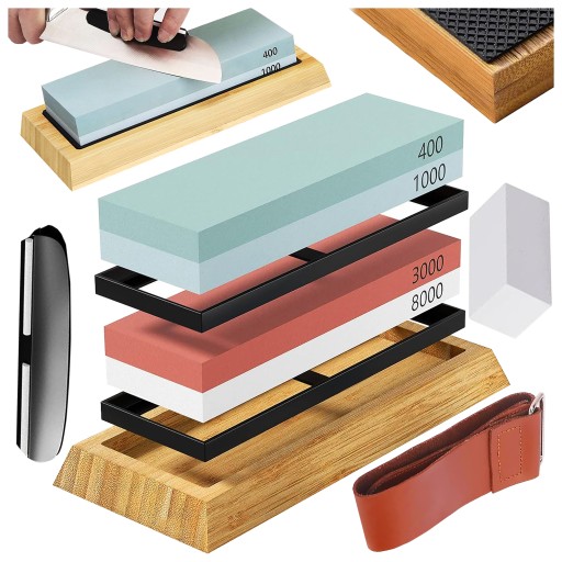 - Oprócz kamieni zestaw posiada estetyczną bambusową podstawkę, skórzany pasek do czyszczenia ostrza, prowadnicę do utrzymywania kąta oraz kamień naprawczy do kamieni.