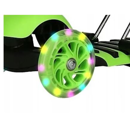 - Ciche, antypoślizgowe kółka 12 cm, wykonane z kauczuku z zatopionymi diodami LED świecącymi podczas jazdy