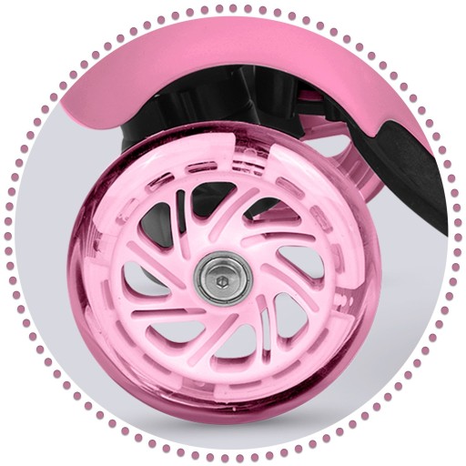 ⭐️ Zastosowanie kauczukowych kółek ma dwie główne zalety. Dzięki nim hulajnoga jest cicha nawet na chodniku, natomiast w domu nie niszczy podłogi i ostrożnie obchodzi się nawet z panelami i parkietem.