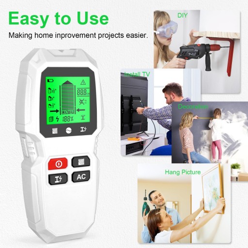 [Użycie]: Szybko zlokalizuj drewno, metal i przewody ukryte w ścianach, podłogach i sufitach domów. Może pracować w listwach, tapetach, podłogach drewnianych, sufitach akustycznych, ścianach malowanych itp.