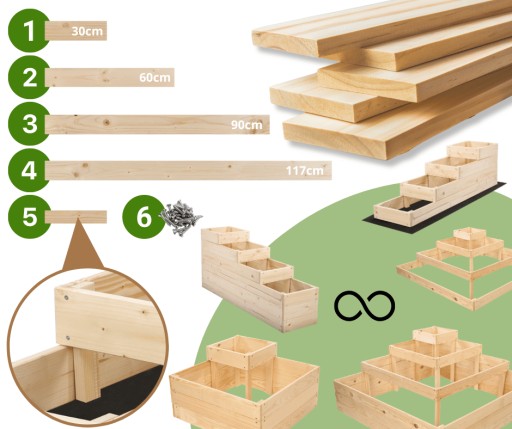 Całą kolekcja naszych grządek pakowana jest pod Twoje zamówienie z litych desek sosnowyh o konkretnych długościach oraz elementów mocujących. Z tego powodu jesteśmy w stanie zapewnić praktycznie nieskończoność kombinacji. Kombinacje możesz zakupić na naszych pozostałych aukcjach.
