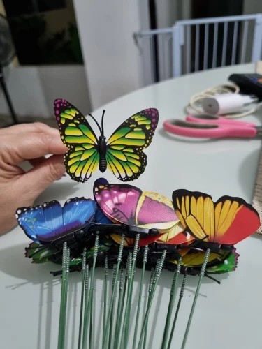 Każdy motyl wyposażony jest w cienki kij, który można łatwo umieścić w ziemi, krzakach lub na gałęziach, nadając iluzję prawdziwego motyla unoszącego się w powietrzu.