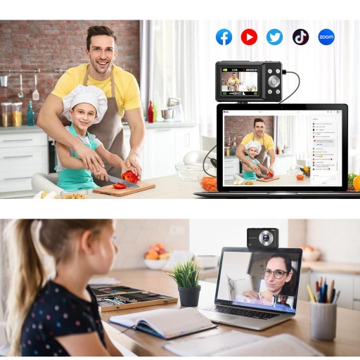 📸-Ten aparat fotograficzny może być używany jako kamera internetowa. Najpierw wyłącz aparaty cyfrowe, podłącz aparat kablem USB, naciśnij jednocześnie przycisk zasilania i spust migawki, aby przejść do trybu kamery internetowej, a następnie możesz nawiązać połączenie wideo. Możesz także przesyłać pliki z aparatu do komputera, aby udostępniać zdjęcia i filmy na Facebooku, YouTube i innych mediach społecznościowych.