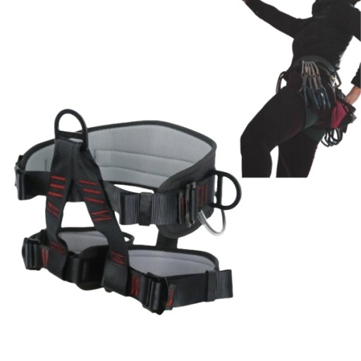 Pas bezpieczeństwa do wspinaczki: Z boku uprzęży znajdują się 2 haczyki na sprzęt i 2 pierścienie D, haczyki na sprzęt są bardzo trwałe i łatwe do zawieszenia innego sprzętu wspinaczkowego Pierścienie D o wysokiej wytrzymałości chronią Cię podczas wspinaczki Wytrzymała czarna klamra umożliwia szybką i łatwą regulację pasa biodrowego i udowego