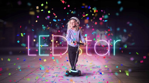 Wystarczy wcisnąć przycisk a kolorowe światełka popłyną jedno za drugim, zgrabnie się przeplotą lub będą rytmicznie pulsować. Hulajnoga LEDstar posiada aż 13 wielobarwnych kombinacji do wyboru, w tym hipnotyzujący tryb rainbow, w którym kolory tęczy płynnie przechodzą jeden w drugi, tworząc niepowtarzalne widowisko