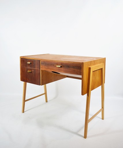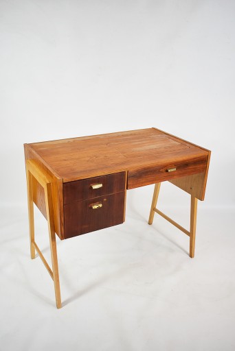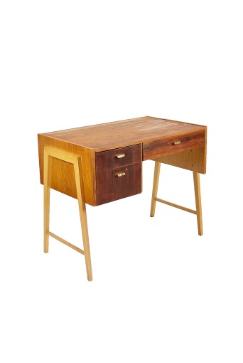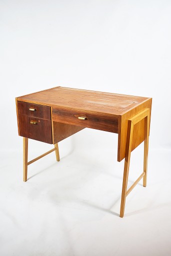 Biurko, mebel po maszynie do szycia, z lat 60. W dnie biurka wiodczny otwór z przeznaczeniem na kable, w blacie widoczna ruchoma część, bedoąca pozostałością po maszynie do szycia. Mebel posiada przetarcia w fornirze, lekkie przeszlify.