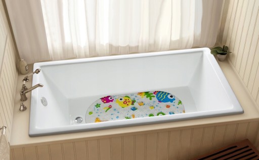 Piękna wzorzysta mata kąpielowa chroni dziecko przed poślizgnięciem się pod prysznicem.