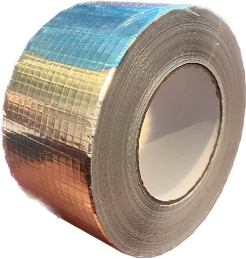 Taśma aluminiowa o grub. 30 mikronów, folia aluminiowa o dużej wytrzymałości na rozciąganie, z wysokiej jakości klejem akrylowym rozpuszczalnikowym, przełożona papierem silikonowym.