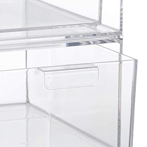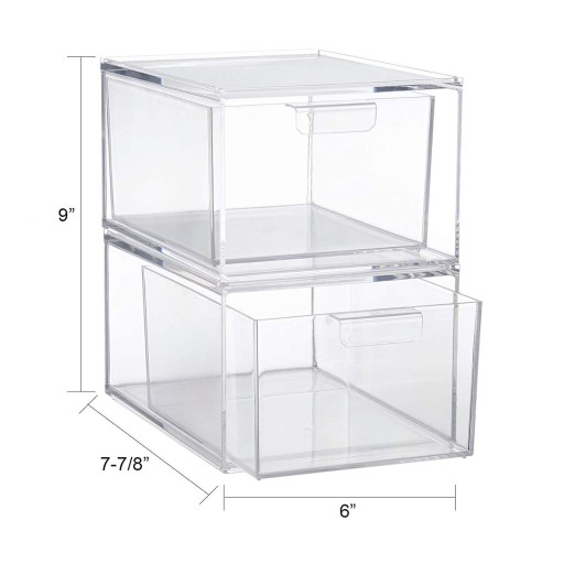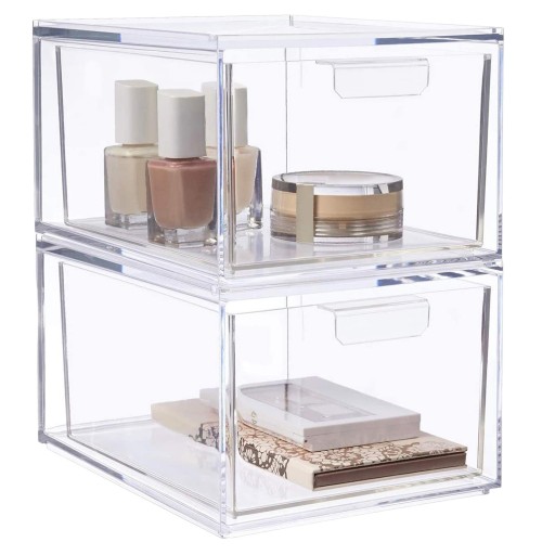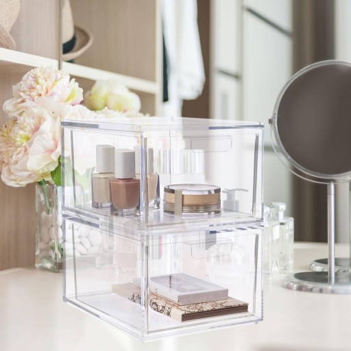 2 przezroczyste szuflady z organizerem na kosmetyki, które można układać jeden na drugim