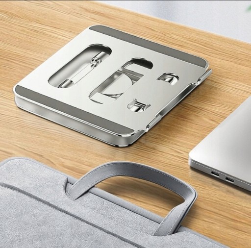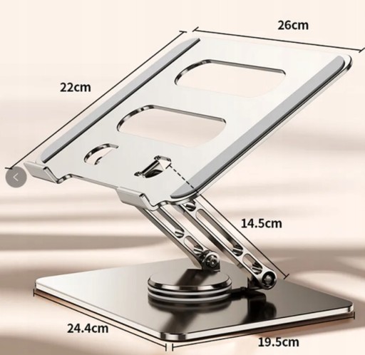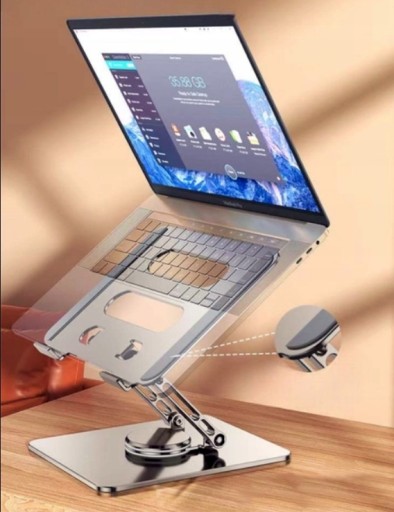 Piękny regulowany, aluminiowy stojak na biurko do laptopów i tabletów, z możliwoścą obrotu o 360 stopni.