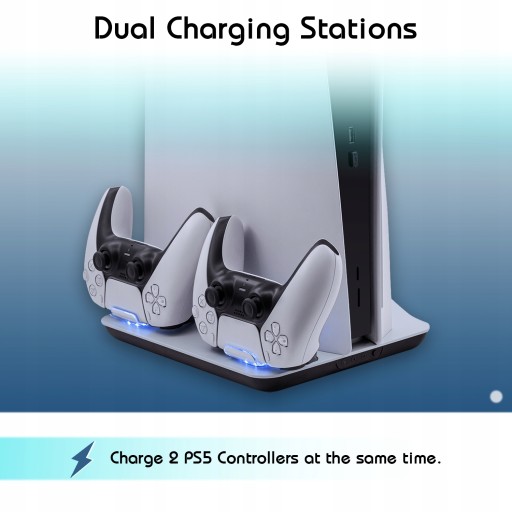 -Podwójna stacja ładująca umożliwia jednoczesne ładowanie maksymalnie dwóch kontrolerów PS5 DualSense. Ładowanie w pionie pozwala na łatwe sprawdzenie stanu ładowania (oddychające pomarańczowe światło kontrolerów).