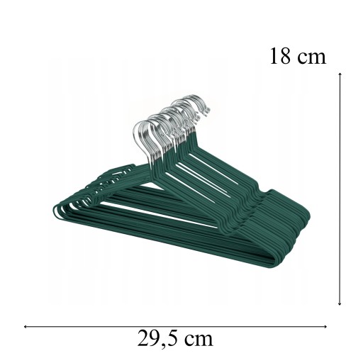 Zestaw 20 szt. wieszaków w kolorze butelkowej zieleni, idealnie dopełnią kolorem szafę Twojego dziecka! Pokryte powłoką PVC zabezpieczą ubranka przed zsuwaniem się, a zaokrąglone ramiona sprawią, że nie będą się odkształcać. Wykonane z wytrzymałego i cienkiego materiału co pozwoli na zaoszczędzenie miejsca w szafie! Dzięki specjalnym wycięciom, bez problemu zawiesisz koszulki na ramiączka oraz sukienki.