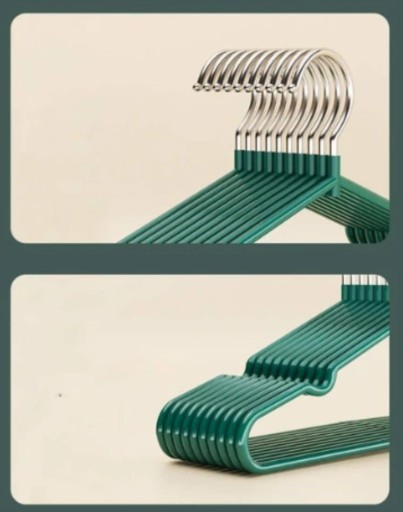 ✅ Materiał: Wieszaki są pokryte powłoką PVC, która skutecznie zapobiega zsuwaniu się ubrań, co pozwala zachować ich doskonały wygląd i uniknąć pognieceń.