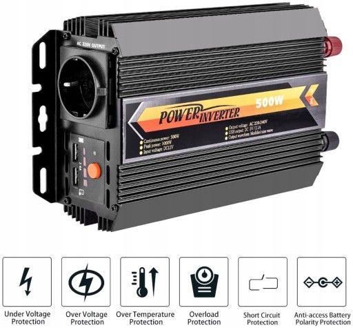 - Dzięki temu falownikowi można ładować lub używać urządzeń 230 V za pomocą baterii 12 V i 500 W.
