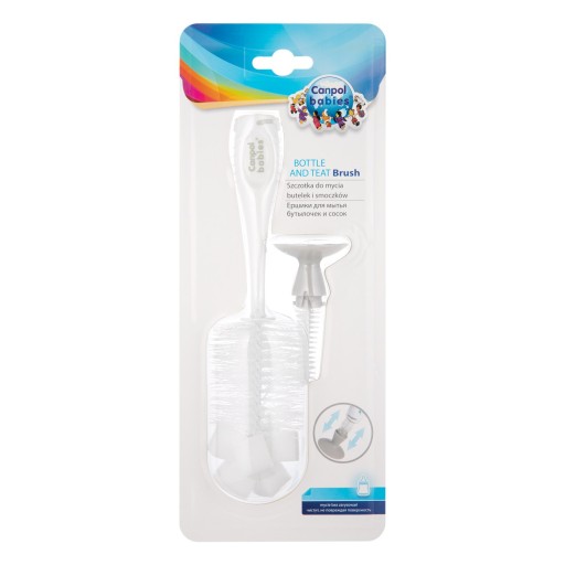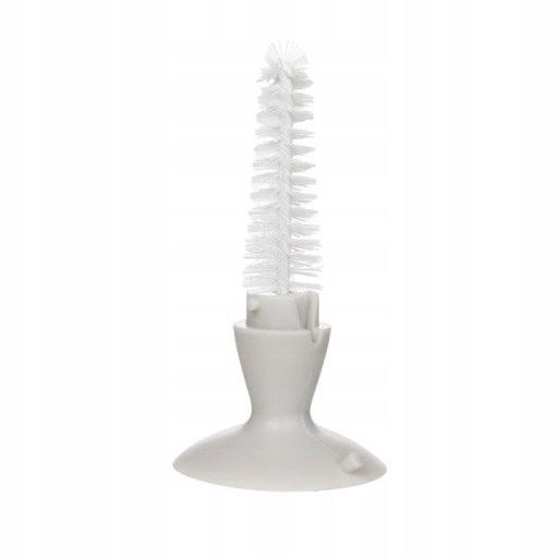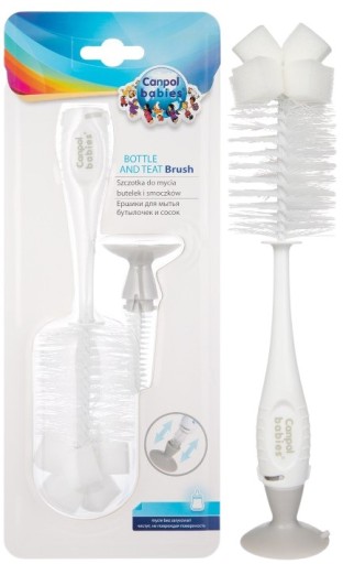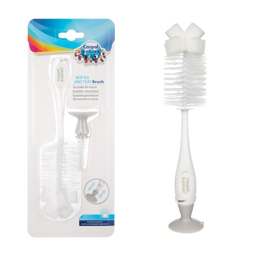 Praktyczna szczotka ułatwia mycie butelek i smoczków. Większa szczotka posiada gąbkę, która pozwala na wygodne mycie dna butelek. Mniejsza, ukryta w końcówce z przyssawką, nadaje się do czyszczenia smoczka z resztek mleka lub kaszki. Szczotka posiada specjalną przyssawkę, która umożliwia stabilne ustawienie szczotki na gładkim podłożu.