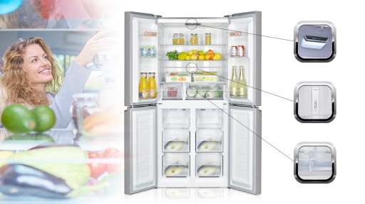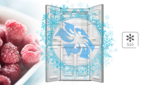 Multi Door MPM-434-SBF-04 posiada technologię NO FROST, dzięki której nie musisz ręcznie rozmrażać lodówki i zamrażalnika. Polega ona na wprowadzeniu do środka urządzenia suchego powietrza poprzez specjalne kanały. Układ wentylacyjny wymusza obieg zimnego powietrza, wyprowadzając całą wilgoć na zewnątrz. W ten sposób szron i lód nie gromadzą się na żywności, półkach czy ściankach lodówki. Szron osadza się w specjalnej komorze, gdzie następuje jego rozmrażanie i usuwanie.