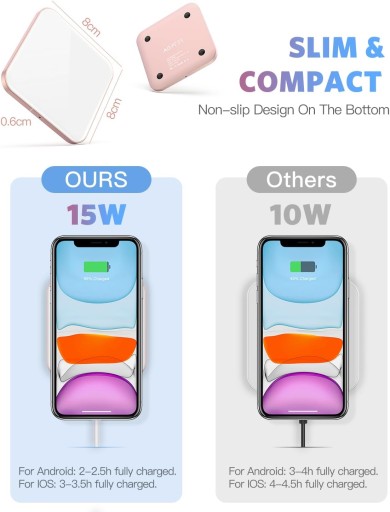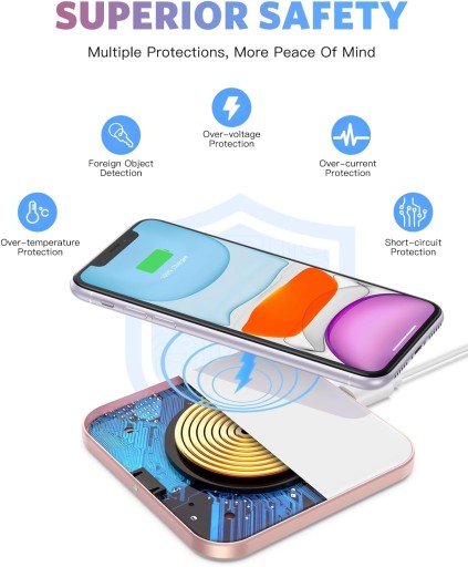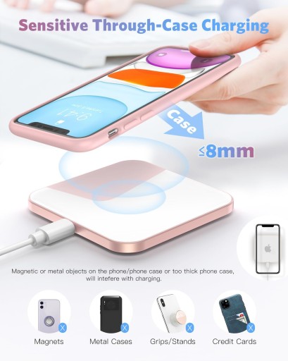 - "Premium And Stylish Design" Własny rozmiar tylko do umieszczenia smartfona, nie mówiąc już o umieszczeniu ich w środku lub nie. 2.5D Szkła hartowana powierzchnia nadaje nowoczesny wygląd mody. Podstawa ze stopu aluminium pomaga w większym rozpraszaniu ciepła, zapewniając bardziej stabilne wrażenia ładowania. Antypoślizgowe silikonowe podkładki na dole utrzymują ładowarkę na miejscu podczas ładowania.