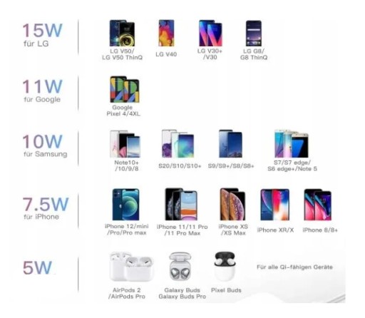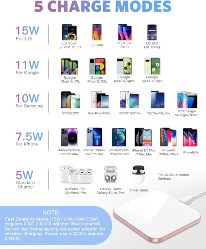 - Tryb ładowania, ładowanie aż do 15 W 15 W-W dla LG V50 ThinQ/V50/V40 ThinQ/V35/V30/V30/V30/G8 ThinQ/G8 ThinQ/G7 ThinQ/G7 ONLY; 11 W tryb szybkiego ładowania dla Google Pixel 4/4XL; 10W tryb szybkiego ładowania dla Samsung S20/Note 10/10+/S10/S10/S10Pro/11 Pro Max/X/XS/XS Max/XR/8/8+ i 5W ładunek standardowy dla AirPods 2/AirPods Pro i wszystkich innych telefonów z obsługą Qi. (Uwaga: adapter QC2.0/3.0 jest potrzebny do szybkiego ładowania.)