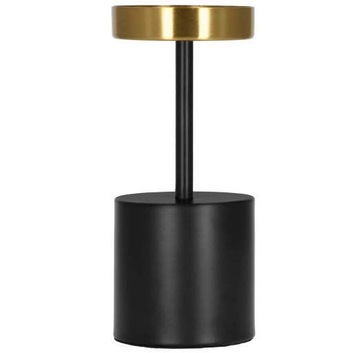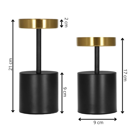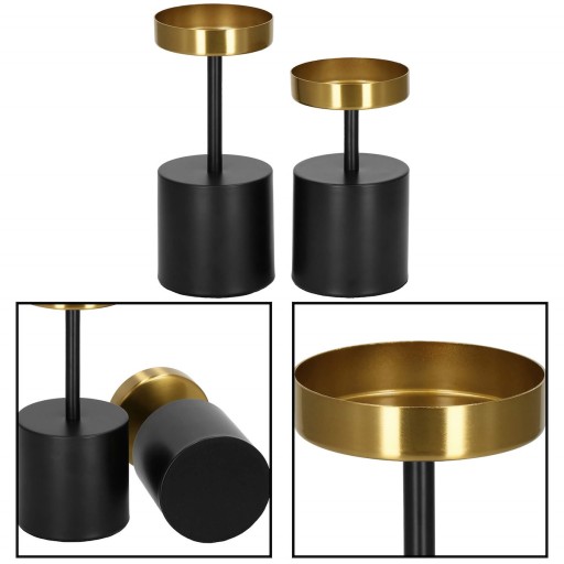 Ten zestaw dwóch szykownych, czarno-złotych świeczników o wąskim trzonie, stabilnej podstawie oraz złotej podstawce na świeczkę, prezentuje się naprawdę majestatycznie! Wykonany został z mocnego, wytrzymałego materiału, dzięki czemu służyć Ci będzie przez lata.