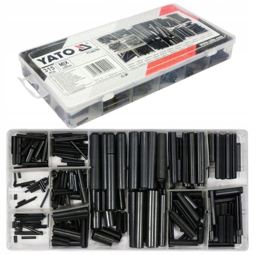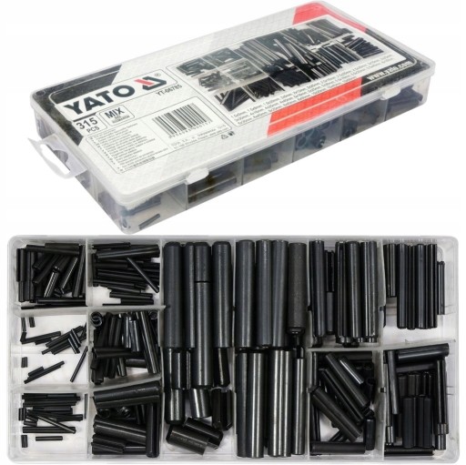 Zestaw 315 sztuk kołków sprężystych/rozprężnych. Zestaw zawiera rozmiary od 1.5x5 mm do 10x50 mm. Całość umieszczono w wygodnym opakowaniu typu "sortownik".
